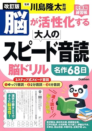 東北大学・川島隆太教授監修。名文を声に出して読む「スピード音読」で脳を活性化。速く読むのが初めての方も大丈夫!1ゆっくり→22分→31分、徐々に速く読む3ステップ式。漢字書き取りでさらに活性化。夏目漱石、宮沢賢治等の名作を68日分掲載。改訂版として新装刊。
